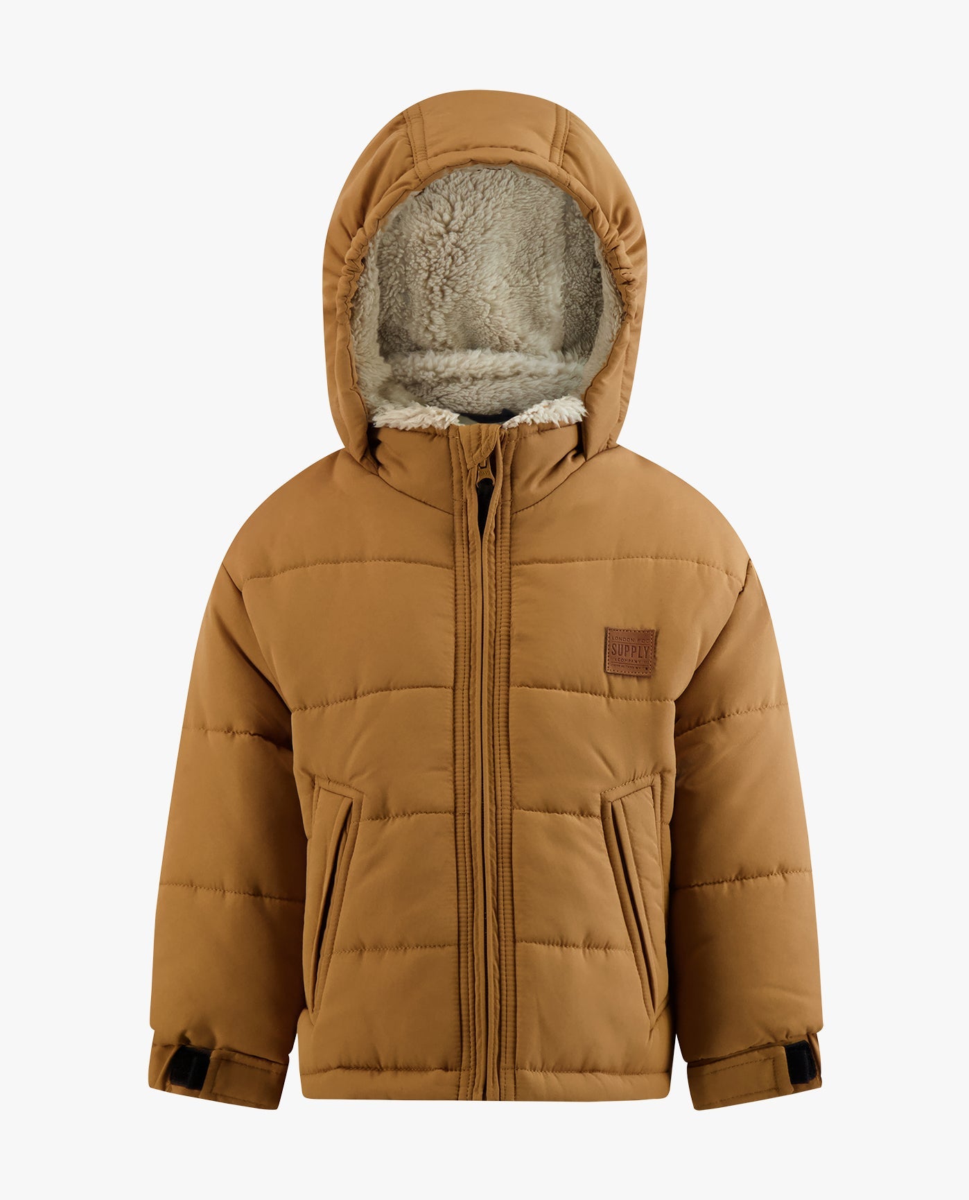 A CLASSIC TAKE ON A BOMBER JACKET, THE COZY SHERPA LINING IN THIS BABY BOYS ZIP-FRONT HOODED SHERPA LINED PUFFER WILL HAVE HIM SMILING IN WARMTH. ZIP FRONT CLOSURE, KNIT CUFFS AND WAIST, KANGAROO POCKET AND A SNUGGED ATTACHED HOOD.